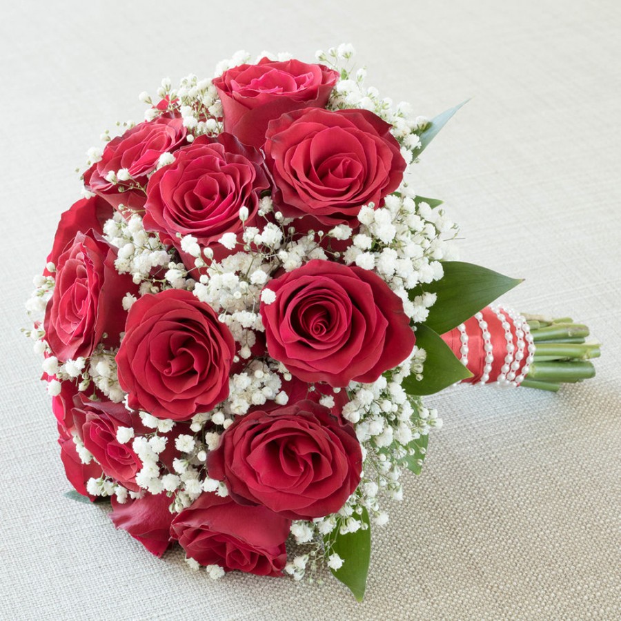 Beneath the gentle glow of central London light, this radiant bouquet captures the timeless romance of a Charing Cross celebration. A compact, rounded spray of deep red roses comes to life, their silky petals in full bloom, some unfurling while others hold their mystery tight. Drifted throughout the arrangement, snowy white baby's breath softens the vibrant reds with its airy, cloudlike clusters, achieving a perfect textural balance. Hints of deep green leaves provide a subtle, organic base that echoes the lush parkland along Victoria Embankment. The bouquet's stems are gathered and wrapped in rich red satin ribbon with crisp white stripes, further adorned by a radiant spiral of petite white pearls, adding a note of urban elegance. Set upon a softly textured, pale background reminiscent of stately interiors found off Northumberland Avenue, each detail is illuminated, from petal to pearl. The gentle, sweet scent of rose fills the air, instantly transporting you to a moment of love and celebration, making this floral composition ideal for weddings, anniversaries, or as the focal point of a romantic Charing Cross event. A proud showcase of local expertise, this bouquet is lovingly crafted to ensure every gesture is as memorable as London itself. Beneath the elegant arches of Charing Cross, this bouquet radiates with bridal grace-a lush dome of deep red roses, each bloom tightly wrapped in velvety petals that conjure images of romance and celebration. Between the roses, delicate sprays of baby's breath drift in snowy white clouds, lending a magical, airy softness that seems to echo the city's morning light dancing along the Thames. The bouquet is grounded by a subtle collar of fresh green leaves at its base, enhancing both colour and contour. It rests in the gentle clasp of a bride's hands, her neatly manicured nails and the textured bodice of her gown revealing both care and personal style. A flowing sash, light as a breeze, cascades to her side, reminiscent of the sweeping marble staircases inside classic Charing Cross venues. The background is blurred to creamy perfection, drawing every gaze to the floral artistry and bridal details at the heart of the frame. This arrangement expresses quiet anticipation and proud tradition-a bouquet well-suited for Charing Cross couples who wish for their wedding flowers to reflect the legacy, artistry, and enduring romance of their remarkable central London setting.