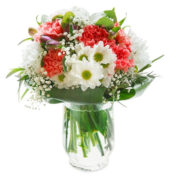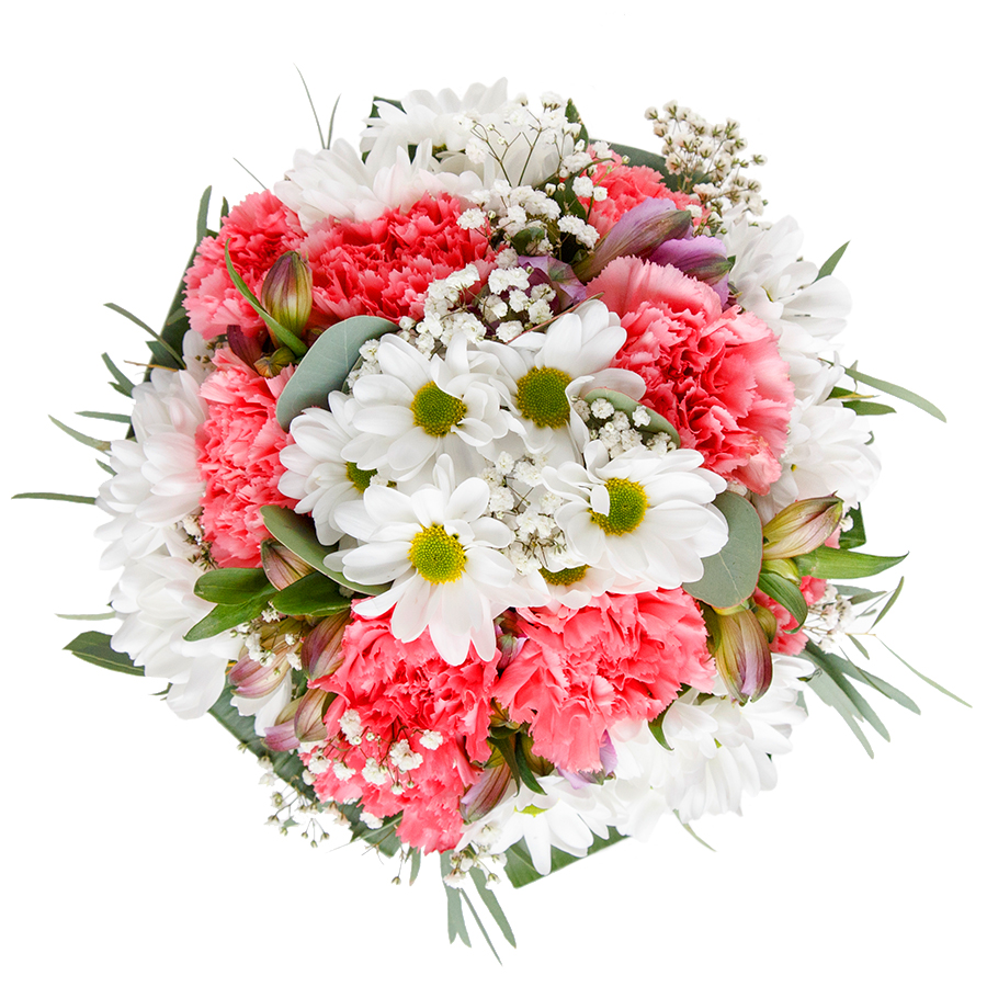 Our timeless and unique flower bouquet is perfect for any occasion. Featuring a harmonious blend of snow-white chrysanthemums, delicate gypsophila, and soft pink carnations, all beautifully arranged with lush aspidistra leaves.